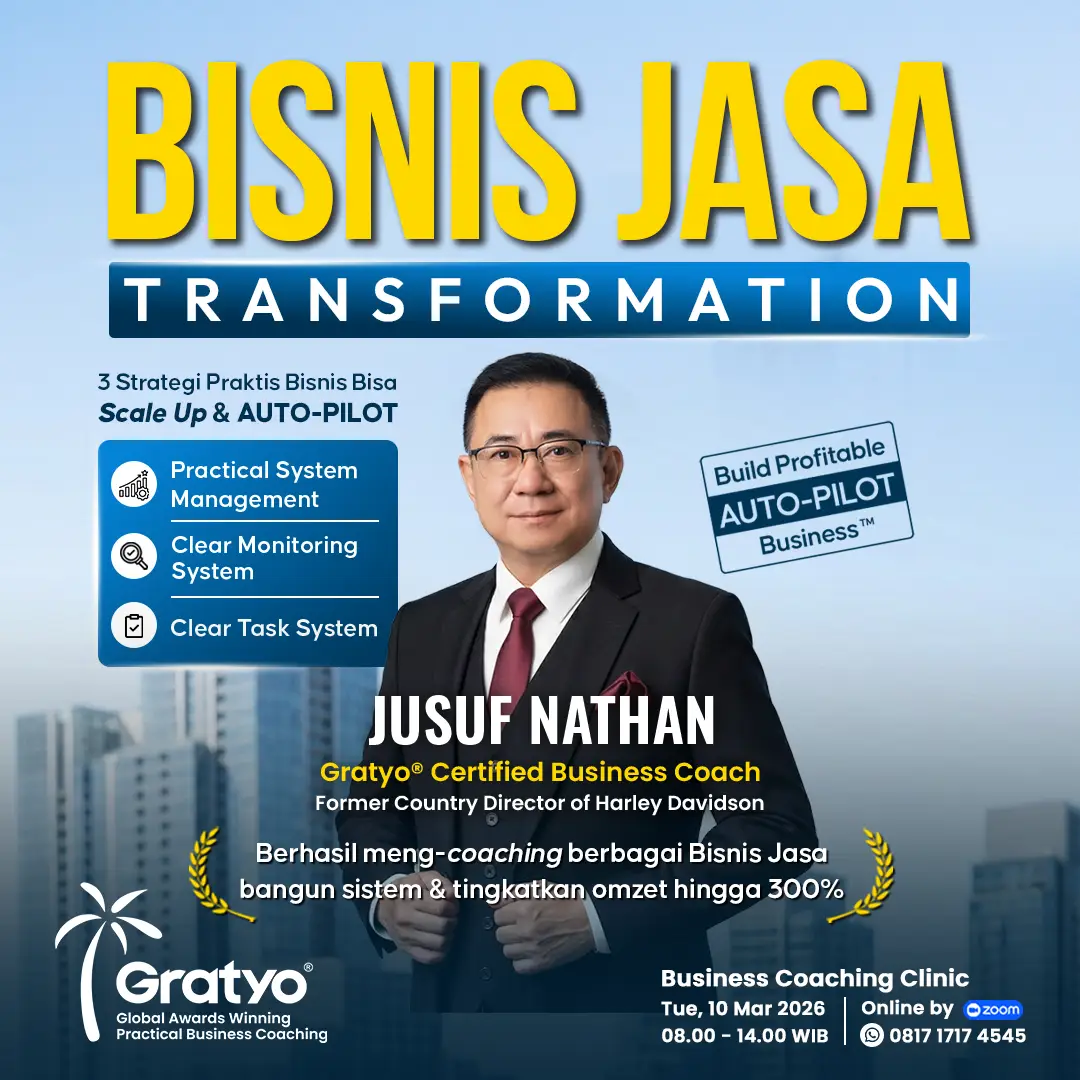 Bersama puluhan high-calibre Certified Business Coach di Gratyo® Global Awards Winning Practical Business Coaching Company berhasil membantu bisnis dengan revenue miliaran hingga triliunan rupiah go to the next level, bisa IPO, hingga bisnis Profitable & AUTO-PILOT™.